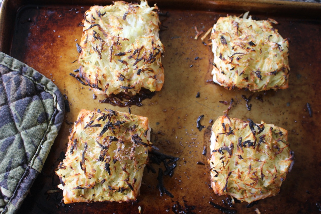 Peel and grate the potato and lay on several sheets of paper towels, or a clean cloth kitchen towel. Wrap the potatoes and wring out any water they might release. Toss grated potatoes with a dash of olive oil in a bowl. Then evenly distribute potatoes on top of each salmon portion. Season with salt and pepper to taste.